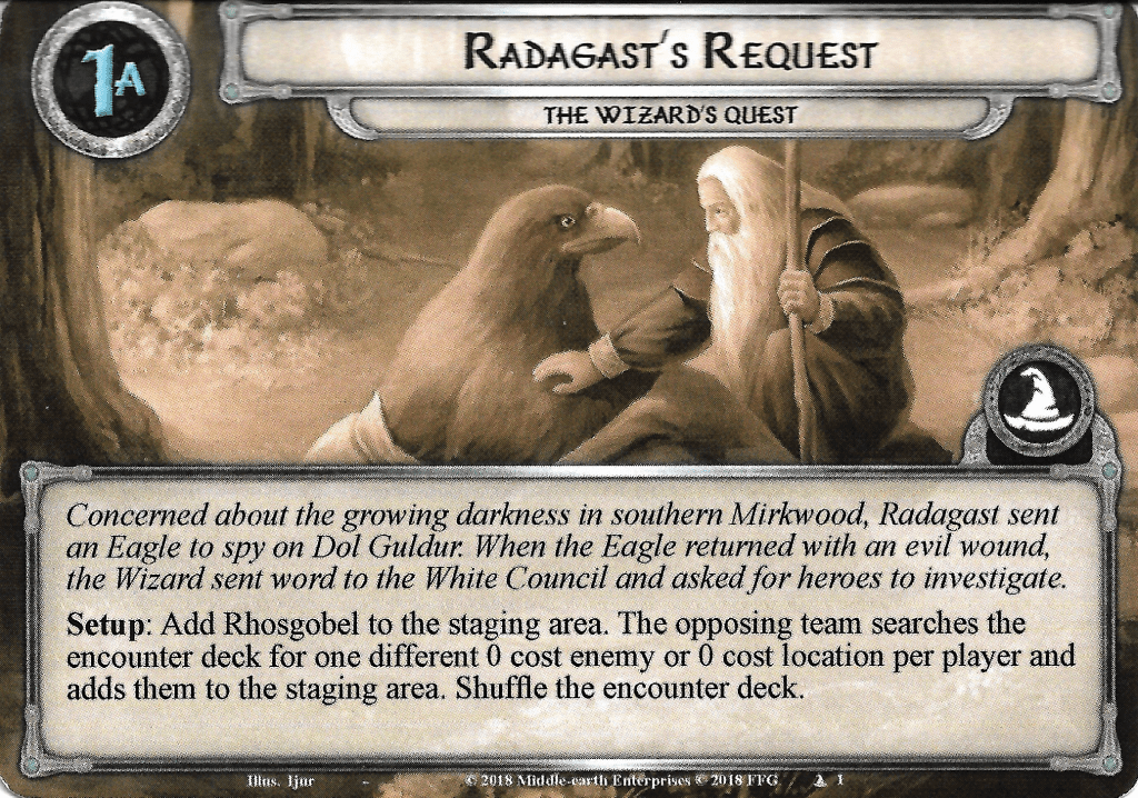 With Rhosgobel in play, the players not playing this quest (the ones that made the encounter deck) get to select one 0-cost enemy or a 0-cost location and add it to the staging area as well. Note that this does not trigger any When Revealed effects! This does allow you to set up certain strategies, like having several Pine Slopes out early to boost their threat. Eastern Crows is also a good pick, as it allows you to get a copy in the discard pile early on if the players happen to kill it.