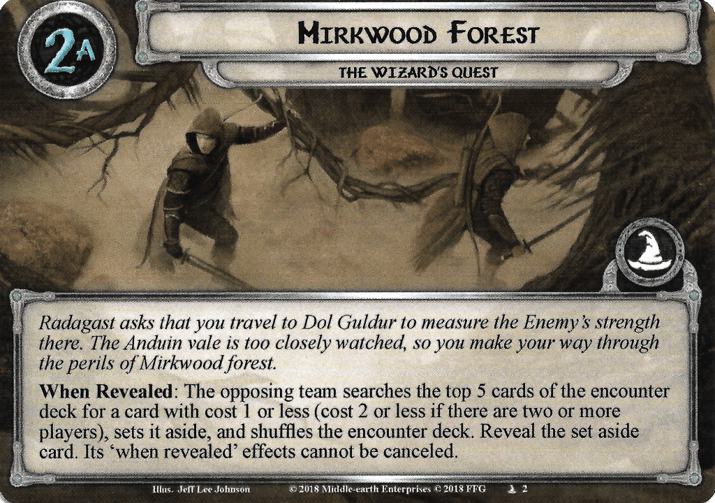 Similar to The Woodland Realm, all stages 2A are identical to each other so that the players have no idea what side B is waiting for them. 2A just informs the opposing team to search the top 5 cards of the encounter deck for a card of cost 1 or less (2 or less if there are 2 or more players) and reveals that card. It is added to the staging area, but its When Revealed effects cannot be canceled. There are some very interesting plays that can be made here, but you have to be lucky enough to find the correct cards in the top 5 of the encounter deck to make it work. Focus some more on your synergy or spring a trap with a treachery that cannot be canceled! Some good options here are: