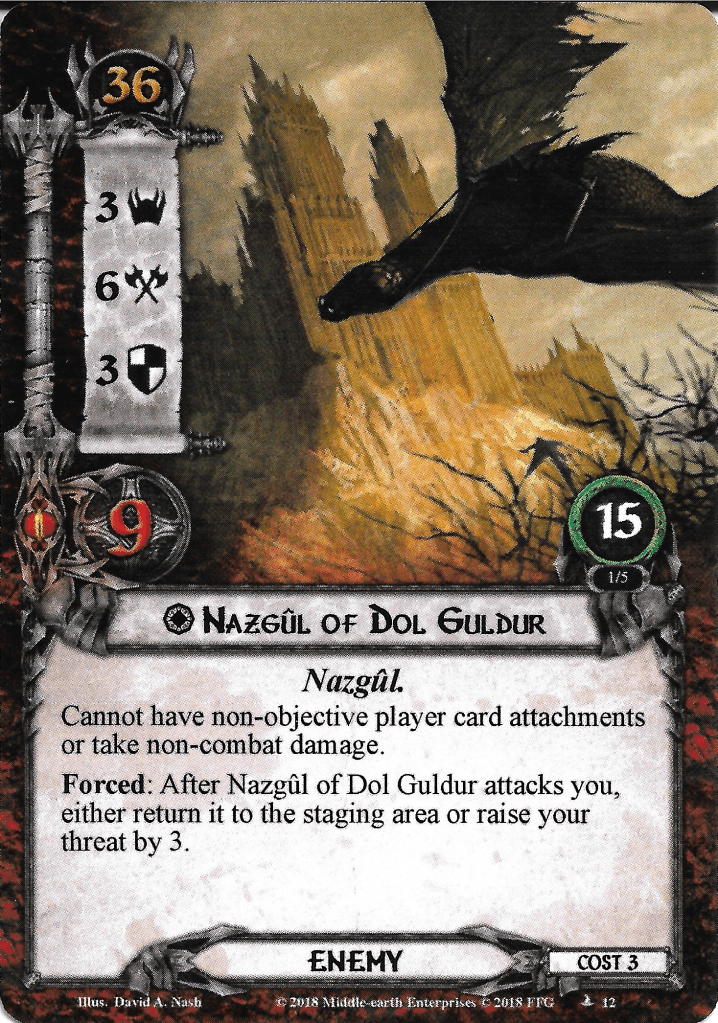 Players will have to dedicate their defenders against this attack, preferably one with Sentinel so that you can defend each player when they become the first player. Note that this will cause the defender to be exhausted during the quest phase, which can be dangerous against encounter decks with a focus on direct damage. Having your main defender exhausted early in the round also makes it difficult to take on additional enemies in the combat phase, such as the Trolls, or additional attacks made in the quest phase through When Revealed effects on enemies and treacheries. Players can also opt to chump this constant attack, but watch out for some horrible shadow effects that could make additional attacks, having to return the active location to the staging area or reveal an additional encounter card.