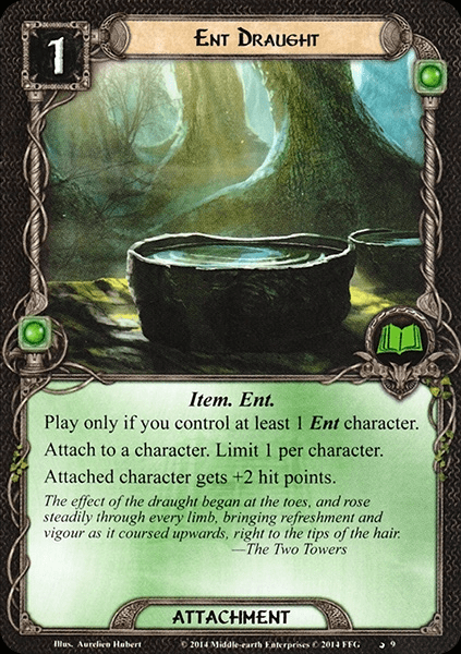 The card does come with a restriction that you are forced to own at least one Ent character. While you can start with one as your hero (Treebeard, Quickbeam, or various MotK Ents), you can also wait a little bit while digging for an Ent ally to play. Have Entmoot in the deck as well, and you can find your allies faster; plus, it fetches this attachment from your deck as well! And it is rare for mono-Lore decks not to run any Ents, making this restriction not all that punishing. Having Ent heroes even makes for a good immediate target for your first copy of Ent Draught, considering their gimmick is taking damage for increased stats or more action advantage. This buys you more time to find your healing cards.