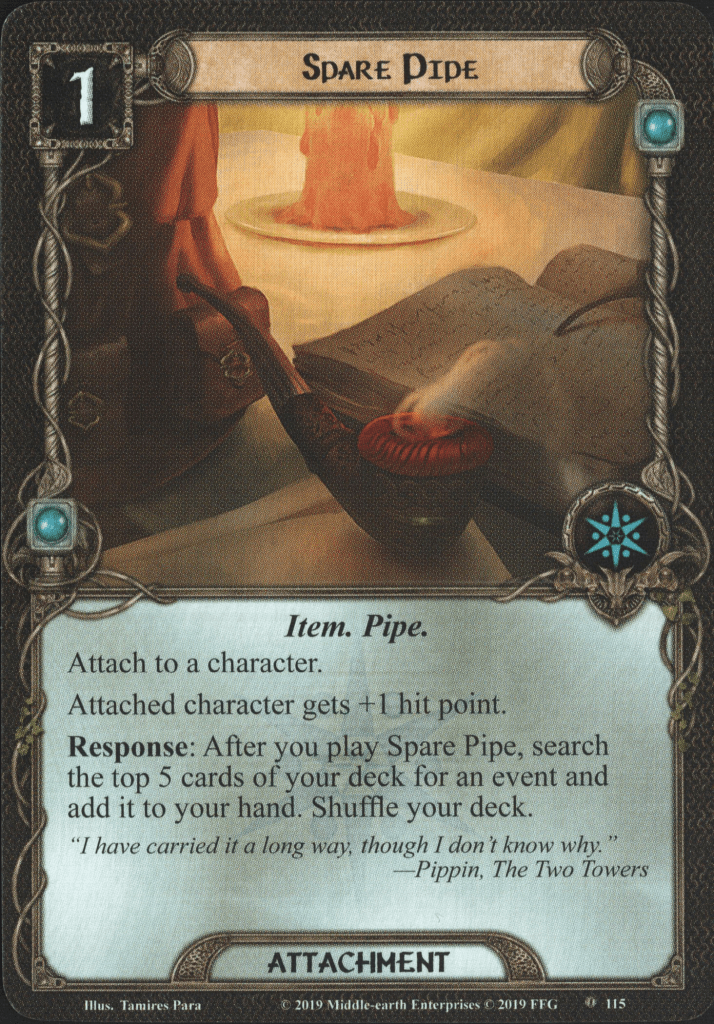 The Pipe archetype never really got a lot of attention during the game’s life, but during the Vengeance of Mordor cycle, there was a last sign of life with the Spare Pipe attachment and the Smoke and Think event. The Pipe is one of the more flexible ones around, not being tied down to a particular archetype like the ones for Wizards, Dwarves, or Hobbits. Instead, the Spare Pipe can go onto any character, which gives them +1 hitpoint. This is a nice way to gain a little bit of extra life without spending too many resources or filling up a Restricted slot. Since this attachment is unrestricted, it can go on both heroes and allies, and you can even have one character wield 3 copies of this card to boost their hitpoints by 3. This does not work well with any Pipe-related events, but if you need a way to boost hitpoints on a single character in mono-Spirit, then this is an option besides the Ring of Barahir.