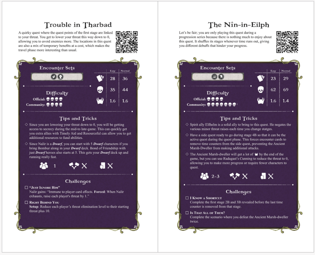 Each page starts with the quest’s title, a short introduction about the quest and its context (easy/difficult, unique mechanics, etc.), and the matching QR code. For more specific info, the box beneath it displays the required encounter sets to play the scenario. Beneath it, it shows the difficulty as decided upon by both FFG (official) and the community (more accurate). The community difficulty was set via the LOTR LCG Quest Companion website, where players can vote on the difficulty of a certain quest. If you haven’t been to the site yet, make sure to visit them and vote on a few quests to make the difficulty sliders even more accurate. Including the community difficulty gives a better representation of the perceived difficulty of a quest, preventing things like Into Ithilien from being deemed a Difficulty 4 quest.