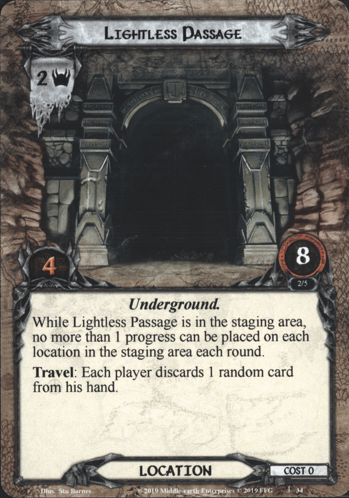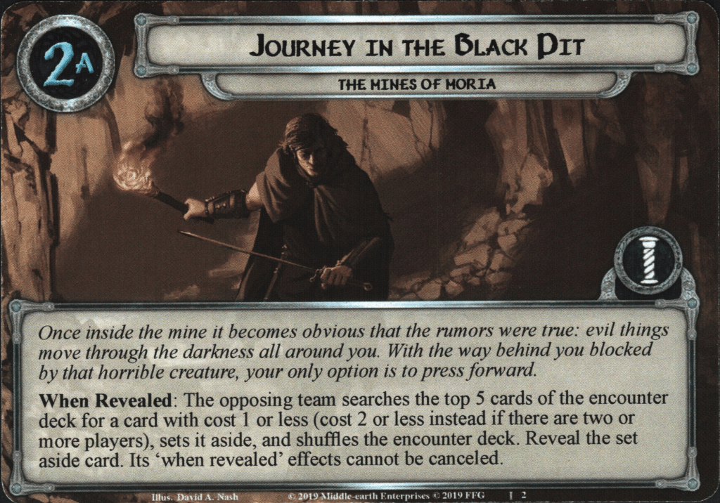 The second option for stage 2 only has a When Revealed effect that goes off when the stage is flipped over. On top of the card that the players had to pick for stage 2A, the opposing team now searches the encounter deck and discard pile for a different 0-cost location per player and adds them to the staging area. Note that these locations are not revealed, so some effects won’t trigger. The locations also have to be different so as to not set up a couple of high-threat copies of Many-Pillared Hall. The options (if they made the cut for the encounter deck) are: