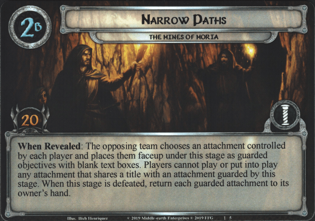 The third option for the second quest stage hits the players with their attachments. When this stage is revealed, the opposing team gets to select one attachment per player and places them face up under the stage so that they are visible to all. These attachments are now considered Guarded, and the players are not allowed to play or put into play any attachment that shares the same name as a guarded attachment. Only by defeating this stage will the attachments be returned, but only to their owner’s hand. That means that if a high-cost attachment is selected, it has to be paid for again if you want to play it during stage 3.