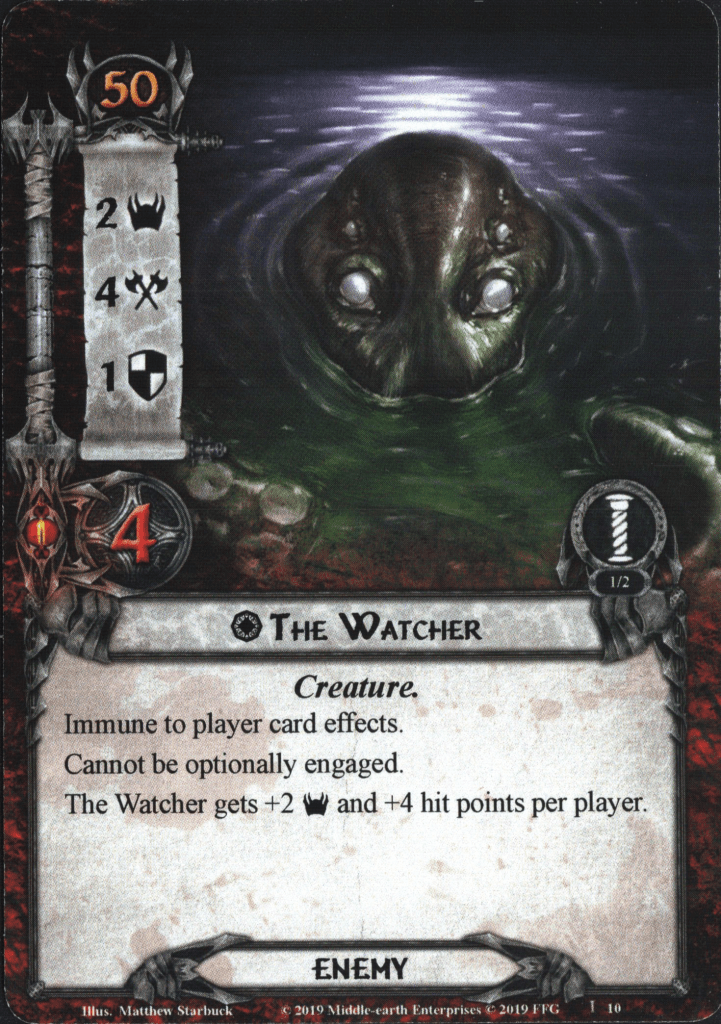 To add to the misery, the Watcher is immune to player card effects and cannot be optionally engaged. The engagement cost of 50 will also keep it in the staging area. The way that the players can start to kill the Watcher can be found on the other side of the quest card. Side 1B requires that the players make 5 progress before they can interact with The Watcher. Once 5 or more progress is on the quest, The Watcher is considered to be engaged with each player and will attack them in turn order during the combat phase. A shadow card will be dealt for each attack. The Watcher will have to be defeated before the players can advance to the next stage.