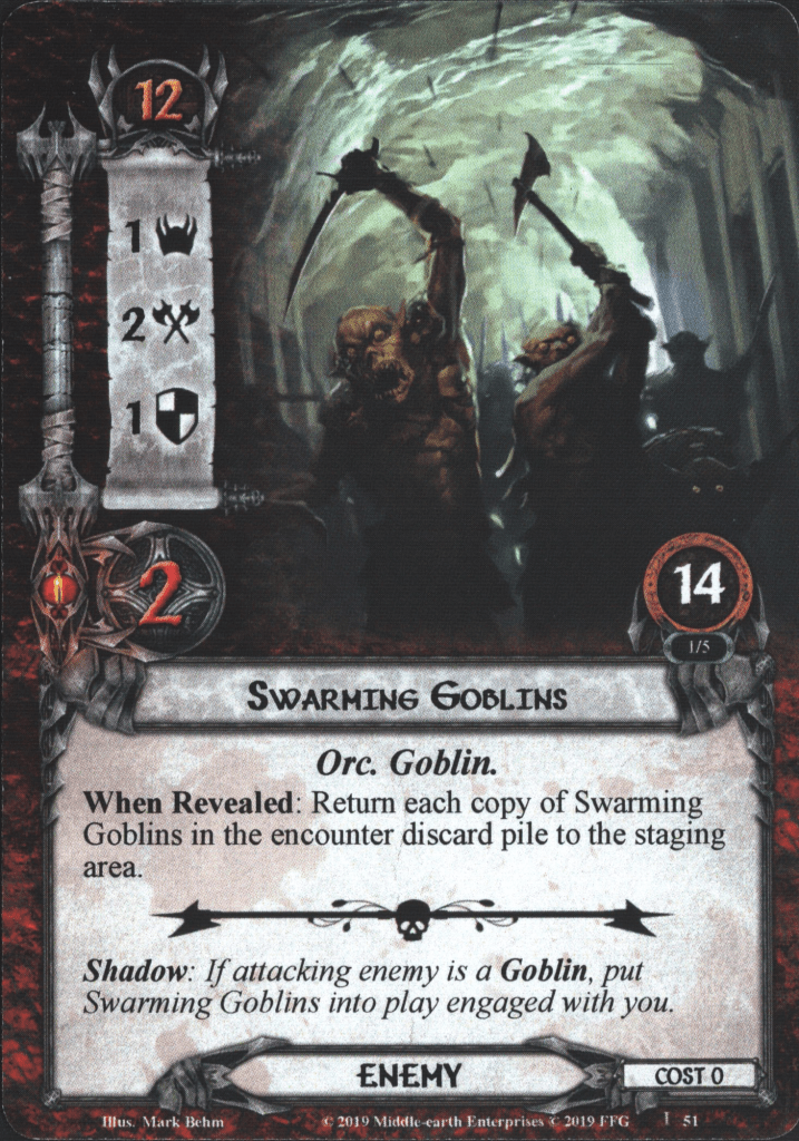 While there are certainly more Goblins to include in your encounter deck if you mix it with the Escape from Khazad-Dum set, there is a nice selection to include in this pack alone. It comes with a unique 3-cost enemy (Goblin Warlord), a location that boosts the attack on each Goblin (Goblin Tunnels), and a host of small Goblin enemies that can engage everyone and try to get even more enemies out. This can be seen with the When Revealed effects on the Goblin Sneak, which fetches an additional 0-cost Goblin, and with the Swarming Goblins that will pull out every copy of themselves that is in the encounter discard pile.