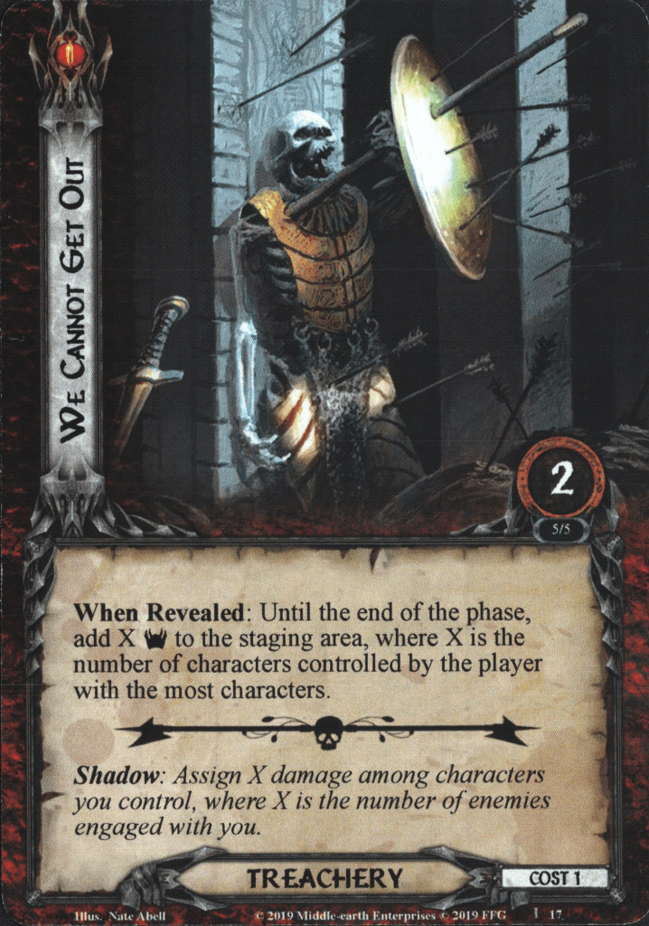There are various ways that cards currently in the staging area also get additional threat that might last longer than a single round. Ancient Guardroom will grow in threat as the opponents play more events, and Many Pillared Hall will gain more threat the more copies of it are in the staging area. Combine this all with Spider enemies returning to the staging area and Signs of Conflict adding +1 threat to all cards in the staging area, and your opponents will need a ton of willpower to get through the quest this round. This can delay their progress, allowing you to get ahead. Of course, this is all an ideal situation, but even one of these cards sitting in the staging area can delay your opponents for long enough. It can also make it pretty entertaining for you as the builder of the encounter deck to see them have to discard all their resources that they were planning to use for something big.