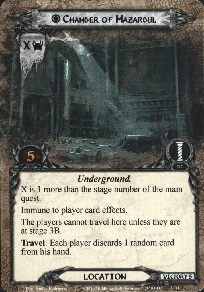 This stage requires the most progress from any stage 3 for this quest and also requires that the players explore the Chamber of Mazarbul. There is no real benefit in exploring this location, but if you are taking things slow, then there is no pressure to explore this location, except for the constant 4 threat that it provides. Once the location is cleared and the final point of progress is made, the players have beaten the scenario.
