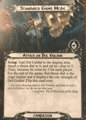 Before resolving the setup on quest card 1A, decide which mode of this quest you want to play, Standard or Epic Multiplayer. There are campaign cards in this set that should be resolved before you start with the actual quest setup. Since I will only discuss the Standard game mode in this article, I will forget about Epic Multiplayer for now, but its setup is largely the same as for Standard, just with 2 additional staging areas.