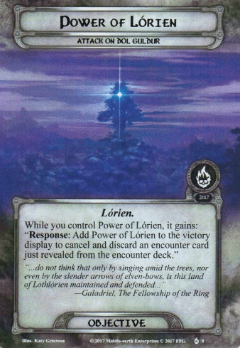 - Power of Lórien: The first of two beneficial objectives you can get is the more expensive one out there, requiring a total of 30 progress to be placed in the first three turns. The objective starts in the staging area and will act as a pool for any leftover progress from the main quest at the end of the round so that each round starts with an empty pool in order to not make the decision to either remove progress or do a horrible thing easier. If the players do not secure the 30 progress during their first three turns, the Power of Lorien card is discarded. That means it might get reshuffled into the encounter deck once it is empty, which means it can reappear again. It can either be an empty shadow card if it is dealt as one or a free encounter card if you reveal it during staging. If it is revealed again, it will just sit in the staging area, not doing anything. You cannot discard it again, so you only get one freebie, though that is a real blessing in this quest.