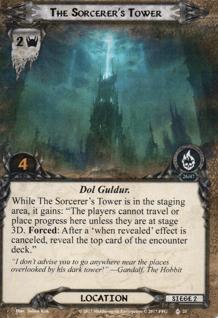 - The Sorcerer’s Tower: If you thought that you would just bring a ton of cancelation effects to counter the many horrible treacheries in this encounter deck, think again. The Sorcerer’s Tower comes with a passive effect that will reveal the top card of the encounter deck each time a When Revealed effect is canceled. This means that while you may have dodged a bullet with your Test of Will, you will pay for it with another encounter card. If you are using effects like Eleanor, you will even have to reveal two cards, as her effect requires you to reveal one as well. This makes it a nasty passive to have in the staging area and usually means you have to suffer through any When Revealed effect that the encounter deck throws at you. However, if you are at stage 3D, you will be able to travel to this location and also be able to make progress on it while it is in the staging area. Placing 4 progress on it while it is in the staging area will require some effort, but if you have been saving up some progress-placing effects like Mirkwood Explorer or Evening Star, then this is the point to use them! Traveling is also an option, but considering that you might want to clear both copies, I would prepare to have some progress-placing effects as well. Alternatively, you can also don’t bring any When Revealed cancelation, which renders the passive effect a bit pointless. At that point, it becomes a 2 threat location that can be easily overcome during the quest phase, so you can focus on traveling elsewhere or going to different stages.