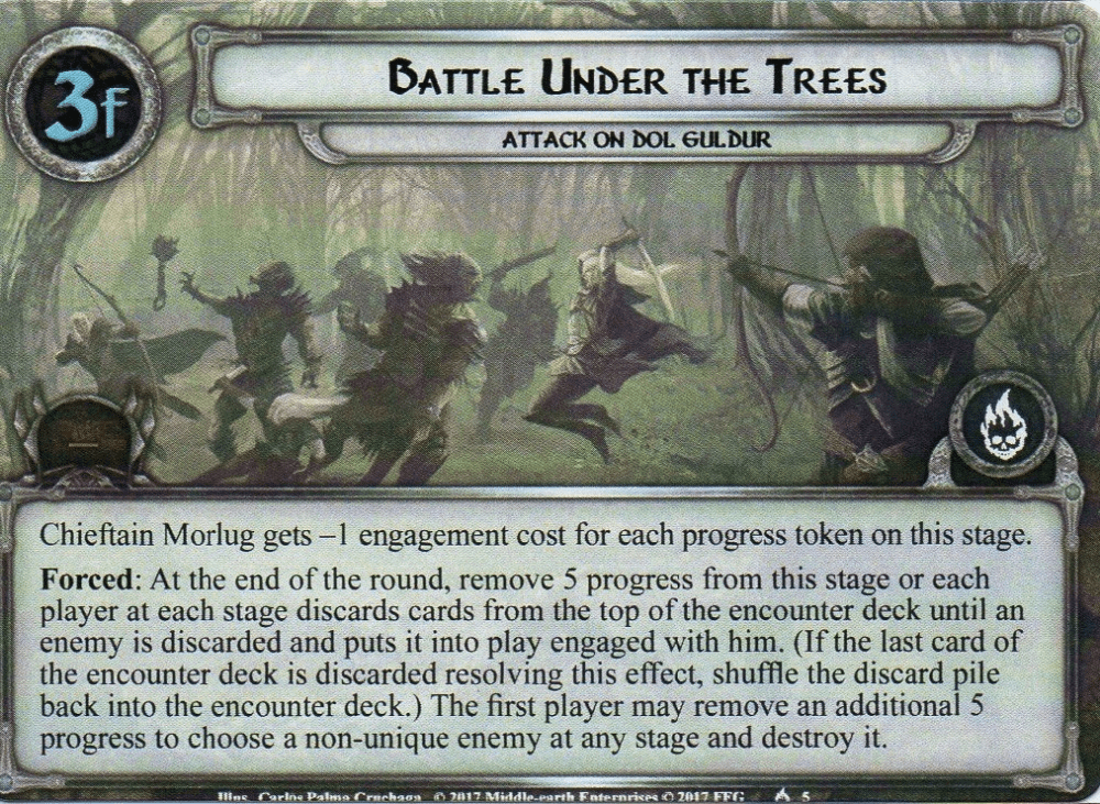- Fastness of Mirkwood: The final treachery on this list is designed to slow you down and not grant you as many boons as you otherwise might get. When it is revealed, no more than 5 progress can be placed on the current quest this round. This means that if no other encounter cards discard any progress, you will just have enough to avoid the negative effects on any stage 3. But you will not be able to get the benefit of discarding an additional 5 progress. During stage 1, this will also slow down your progress massively and could mean that you miss out on Power of Lorien. Because you can only make 5 progress, any encounter card that would remove progress from the quest will cause you to have to do the negative effect at stage 3, so this isn’t ideal. Even worse, this treachery can surge if Dol Guldur’s city strength is at 5 or lower. This will only matter for the end of the game but can prevent you from reaching a city strength of 0 if you are going to The Siege of Dol Guldur and were hoping to get the additional 3 resources removed from it. You can still clear the active location, at least, but this one treachery could slow you down overall.