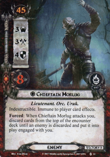 - Chieftain Morlug: The Orc Lieutenant stands out for having the lowest attack of all Lieutenants but the highest defence overall. The low attack stat is compensated by the fact that the Forced effect will drag out an additional enemy for you to deal with. This enemy is the first one discarded from the top of the encounter deck, so you will have little control over which it is going to be. This uncertainty can lead to a risky combat phase since you can suddenly find yourself engaged with a Host of Dol Guldur out of the blue. Because Morlug will do this each time he attacks, it is not advised to go to his stage once the city strength is low since he will attack each player and get each of them a new enemy. This makes him less of a threat, though underestimating a 3 attack enemy can be dangerous with the shadow effects in this quest. The good thing is that, while player card effects cannot target Morlug, they can target the enemies he drags out, plus you get more enemies to kill in order to bring down the city strength even further.