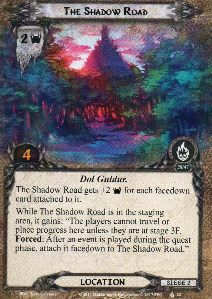 - The Shadow Road: The next stage-specific location is The Shadow Road, which can only receive progress in the staging area or be traveled to while the players are at stage 3F, Battle Under the Trees. This location can be a deciding factor for going to that stage since it can balloon to a very high threat, thus preventing more progress from ending up on the main quest. The Shadow Road starts the game as a 2 threat, 4 quest point location, but will gain 2 threat for each card placed face-down underneath it. These face-down cards are any events that the players use during the quest phase, which can accumulate quickly! Not only can this be willpower boosts or cancelation events, but also anything to deal with attacks made during the quest phase. This location is obviously worse in higher player counts, as more players will want to play events during the quest phase. You also have to set some sort of reminder because this is an easy thing to forget. While there are two copies of this location in the encounter deck, the events played during the quest phase can only be put underneath a single copy of Shadow Road, so only one copy gets the threat boost. I would advise stacking everything underneath a single copy instead of alternating between the two. This allows you to travel to a single copy of the location while you are at 3F, allowing you to clear a lot of threat all at once. Having a single high-threat location also makes it a better target for effects like Spirit Aragorn, threat-reducing attachments, and Secret Paths, though this is an event that will boost the threat of the location in subsequent rounds. Thror’s Key is also excellent for one copy of this location, as you can now clear it in the staging area, travel to it at any point, or just ignore it because the threat will not be increased by cards underneath it.