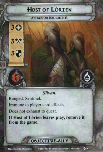 The first of two beneficial objectives you can get is the more expensive one out there, requiring a total of 30 progress to be placed in the first three turns. The objective starts in the staging area and will act as a pool for any leftover progress from the main quest at the end of the round so that each round starts with an empty pool in order to not make the decision to either remove progress or do a horrible thing easier. If the players do not secure the 30 progress during their first three turns, the Power of Lorien card is discarded. That means it might get reshuffled into the encounter deck once it is empty, which means it can reappear again. It can either be an empty shadow card if it is dealt as one or a free encounter card if you reveal it during staging. If it is revealed again, it will just sit in the staging area, not doing anything. You cannot discard it again, so you only get one freebie, though that is a real blessing in this quest. - Host of Lórien: While starting the game out of play, the Host of Lorien is actually the objective you will interact with most. It is the easiest of the two objectives to earn, requiring just 10 progress on Power of Lorien in order to obtain it. The first player gets this ally when transitioning to stage 2, but it will stay with that player for the rest of the game. The Host sports some amazing stats (especially for a Silvan ally) with 3 willpower, attack, and defence, 6 hitpoints, and both the Ranged and Sentinel keywords. So it does not matter who has this ally since it can help across the table. The one negative about the Host is that it is immune to player card effects, which means it cannot take advantage of attachments or buffs like Celeborn‘s. In exchange, you do get to use the stats on the Host a lot, as it does not require you to exhaust it to commit to the quest. This protects it from the Necromancer’s Rage and means you can both use it for 3 willpower and for attacking or defending across the table in the same turn. The 3 defence, 6 hitpoints, and Sentinel keyword make it a worthy defender that can stand up to the Host of Dol Guldur without dying (if the shadow cards are kind). It can also withstand a lot of punishment from the Lieutenants and other smaller enemies, leaving your own allies to deal the damage back to your enemies. This is certainly a card that’s worth keeping around once you earn it. Should you ever lose this ally because of damage dealt beyond its hitpoints or through a “discard an ally” effect, then the Host of Lorien is put out of play and cannot re-enter play for the rest of the game.