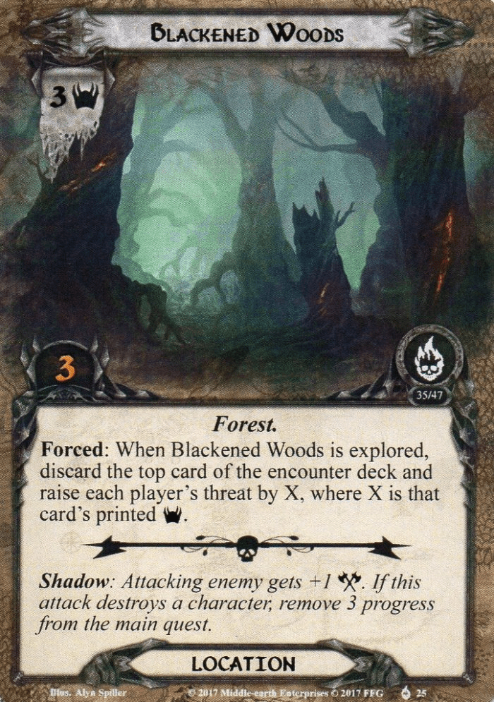 If none of these cards are playable at the moment, players will have to stomach the threat for a turn but may decide to travel here if there is no better alternative. Traveling comes at no cost, though the location will take 5 progress to clear, which is the most out of any location in the deck. Once the Forest Battleground is explored, each player must also find an Orc enemy from the encounter deck or discard pile and add it to the staging area. This can fill the staging area with enemies again if the players were looking for some easy targets during the combat phase. All in all, I think this is a location you really have to keep in the back of your mind when building for this quest. Large ally swarms will be punished, so have a way to counter the insane threat this location provides. - Blackened Woods: The other location that is free to travel to at any stage is the Blackened Woods. This does not have the potential for an insane amount of threat, but 3 threat is still enough to eat away at your progress while it is in the staging area. Traveling is possible, but I would argue this is the lowest priority destination during the travel phase, except for locations that you aren’t allowed to travel to yet. 3 points of progress are required to clear it, which isn’t too much. The problem is that you have to raise each player’s threat once you do clear the location. Players have to discard the top card of the encounter deck and raise their threat by the threat of that encounter card. With a bit of luck, you hit a 0-threat treachery, but you can also hit a 4 threat Olog-hai. The average threat in this quest isn’t too bad, especially since the threat boosts on Host of Dol Guldur and Forest Battleground do not count. But clear too many of these locations during your game, and threat will really start to be an issue, especially if Gate of Dol Guldur does not allow you to lower your threat by much. This location is best explored while it is in the staging area, allowing you to travel to other locations instead. Yes, you will have to raise your threat from time to time, but with a bit of luck, it won’t be too bad. One player can also sacrifice their threat by raising it by 3 to discard (and thus, not technically explore) the Woods with Heirs of Earendil, which is a great event for this quest.