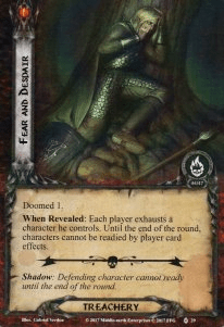 - Fear and Despair: This first treachery hinders your ability to ready characters through player card effects, which means that before you start to reveal cards during the quest phase, you should use any Unexpected Courages or other readying effects that you have. The treachery will raise each player’s threat by one, which isn’t the end of the world. It will then force everyone to exhaust a character they control, and then characters cannot be readied until the end of the round by player card effects. This will hurt players with Three Hunters decks and those without a lot of allies the most, whereas swarm deck will generally be ok with this treachery. Remember that while players cannot ready characters themselves, they can still be readied during the refresh phase as per usual. That is not the case when this card’s shadow effect, which will target the defending character and prevent them from readying until the end of the round. That means they miss the refresh phase and will stay exhausted during the next round as well. Again, you should use your readying ability before revealing the shadow effect if you want to be safe.