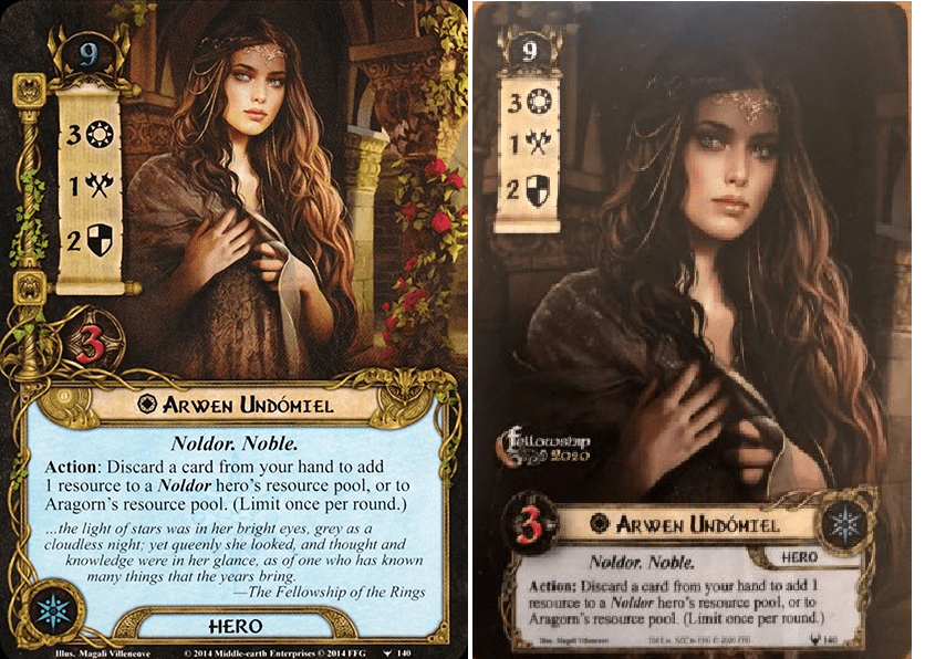 That is where alternate art cards come in. These cards work the same as the originals but feature different artwork or a different format than the regular cards. A good example of this being done by FFG themselves is the Collector’s Edition, released back in 2018. This box contained two player decks and two quests, all with a different format than the traditional cards. This made it easier to distinguish the cards from their regular versions, and the zoomed-in artwork refreshed some cards, like Unexpected Courage, a little bit.