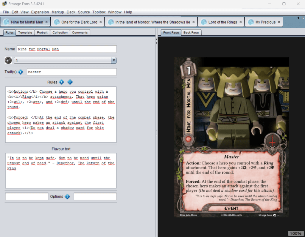 Many people wonder how the community is able to make so many alt arts themselves. The truth is that you do not need any Photoshop skills to do this; all you need is a single program. That program is called Strange Eons and can be found using this link: https://strangeeons.cgjennings.ca/download.html. The program allows you to rework templates for LOTR LCG to create your own cards. Not just alternate art cards but also if you want to make a new card altogether. This is what some fan-made projects use as well, and it is the most user-friendly interface over alternative software that might produce higher-quality cards.