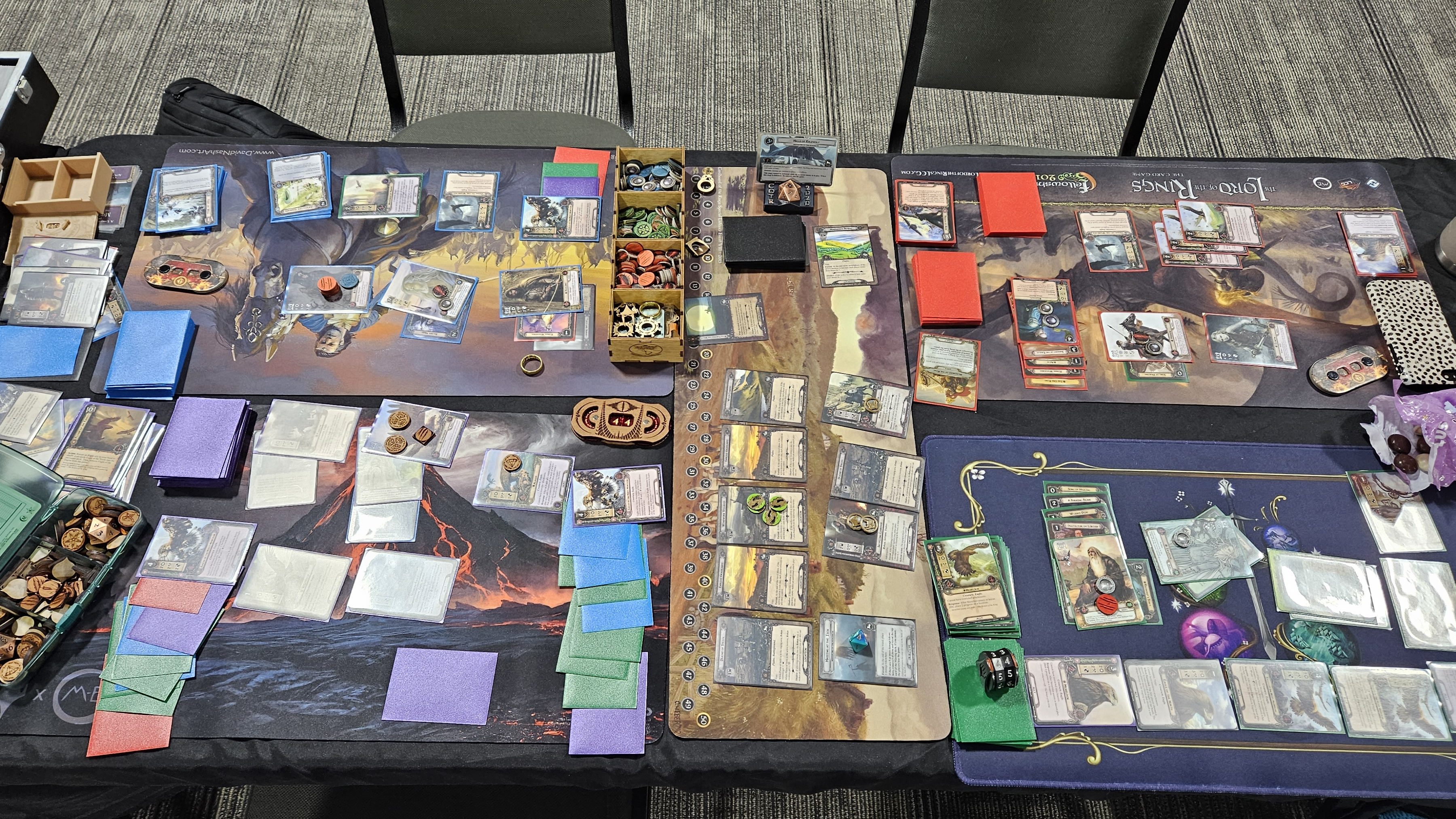 With that quest over, I had a quick bite to eat and looked around for my final game of the Con. I managed to get that going with Thaurdir, who did the design for the Field Guide and his parents. We did a 4 player run against Fire on the Eastemnet and were victorious. It was my first attempt at that quest, and I played my mono-Spirit Caldara deck. Sulien did a lot of heavy lifting, as she was readied by Narya to lower the threat of all locations in the staging area by 2. That helped relieve the location lock a lot.