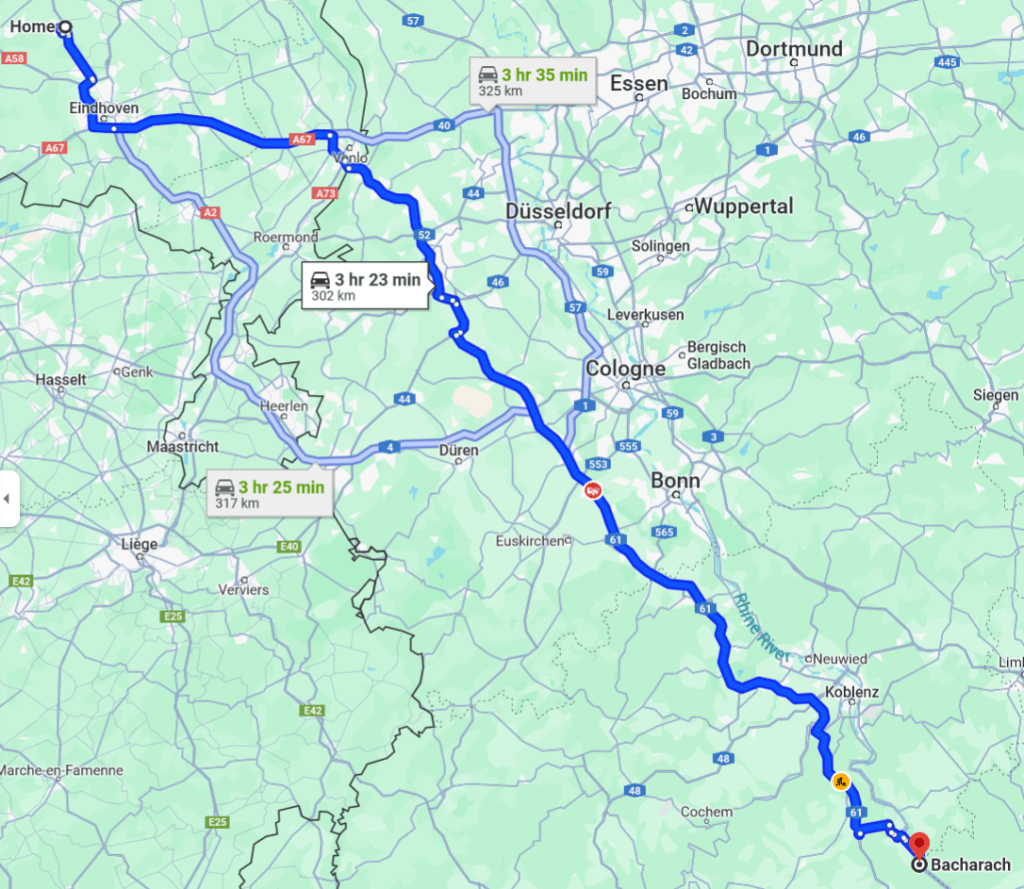 In the meantime, I was on the road again. I had no other stops planned between Bacherach and Boxtel, so I managed to climb out of the valley with my car and onto the highway. I stopped about a third of the way for lunch, as there was a good restaurant not far from the highway that had fantastic schnitzels. And if you’re ever in Germany, you can’t leave before you’ve some of those. With a full stomach, I got through the rainy roads back to my flat country, arriving home at about 14:45. There was not too much traffic on the road, and there were no trucks, so it was pretty smooth driving. Episode 224 of COTR was just long enough to last me until Eindhoven, which has me caught up with the podcast again. Once home, I unpacked, got into some more comfortable clothes, and wrote this article!