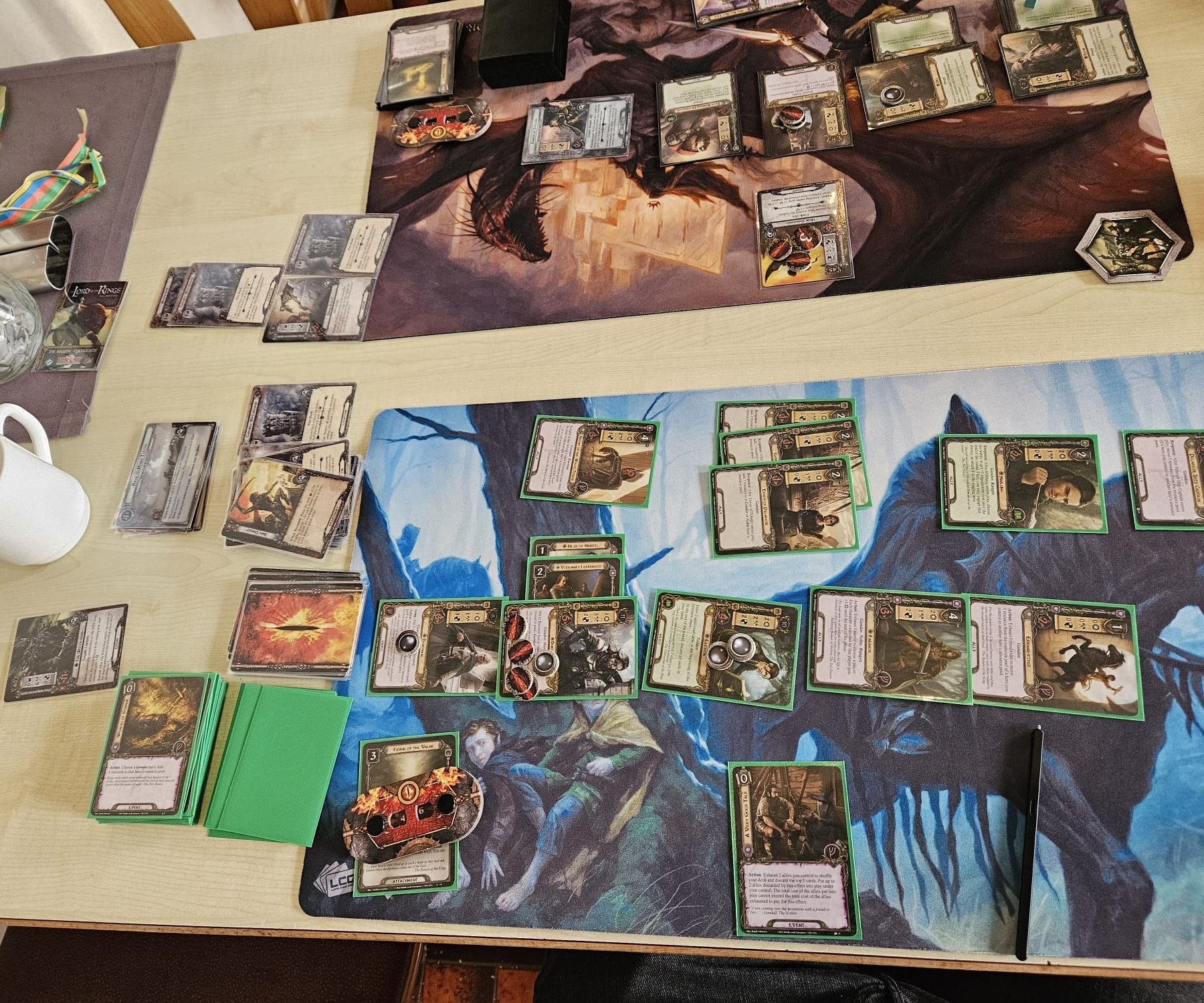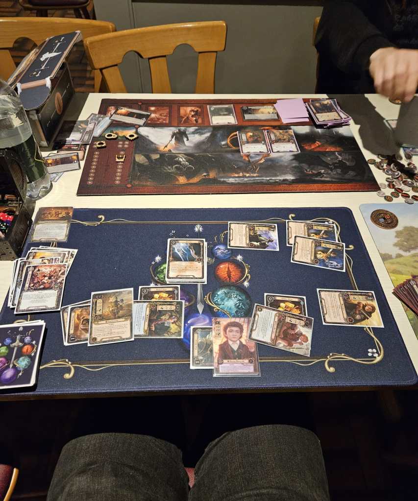 After the announcements, I went up to the Tower Room to join in on the draft taking place there. For those of you unfamiliar with the format, you try to beat a quest with decks made from a set amount of cards. You get to pick and choose the cards from different hero packs and have to hope your teammates give you helpful cards for your deck. I started with Tactics Legolas as my hero and built around that with Beregond for defence and Damrod for trap support. Plenty of Ranged and Sentinel support helped other players, and I had enough card draw to see the entire deck in action (you build a 40-card deck in Draft format). With the decks made, we ended up going against Hunt for the Dreadnaught (more like Hunt for the Draftnaught) with 4-players. I had my Ranged and Sentinel support (no traps, those don’t work on ships) and was joined by GalacticTrendsetter (mono-Tactics with Aragorn–Hama–Hirgon) and two Filipo from Italy’s (Noldor-Discard with Cirdan–Arwen–Galdor) (Gondor swarm LBoromir–Denethor–Ingold). We managed to beat the Dreadnaught in 9 turns, with the help of a Sea Monster dealing the final blow to the ship. A big shout-out to Rouxxor for hosting the draft and preparing the card packs. I have done drafts before, but it is always a surprise to see what you end up with.
