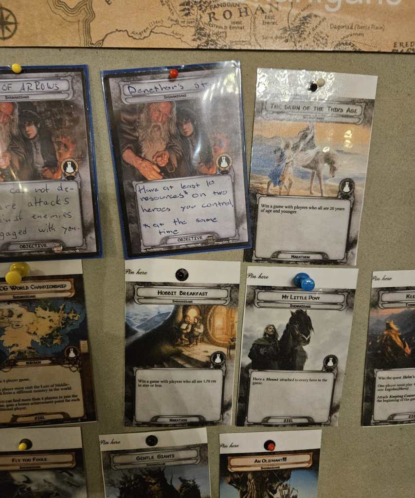 After most people finished breakfast, we had the morning announcements at 9:30. This included a rundown of people attending the convention for a given number of years, earning them some nice swag. For 5 years attending the LOTR LCG side of the convention, you earn a nice playmat with the same artwork as is used for the Lure of Middle Earth player card. There were even some MECCG players who had their 20th Lure convention this year there! This rewarded them with a different playmat with the convention’s logo on it. It’s cool to see such dedication being rewarded. Aside from the anniversary gifts, the announcements also included the schedule for the day. This was mostly a chance for people to experience fan-made scenarios from AleP and LoF in the tower room. The rest of the places were available for general play.