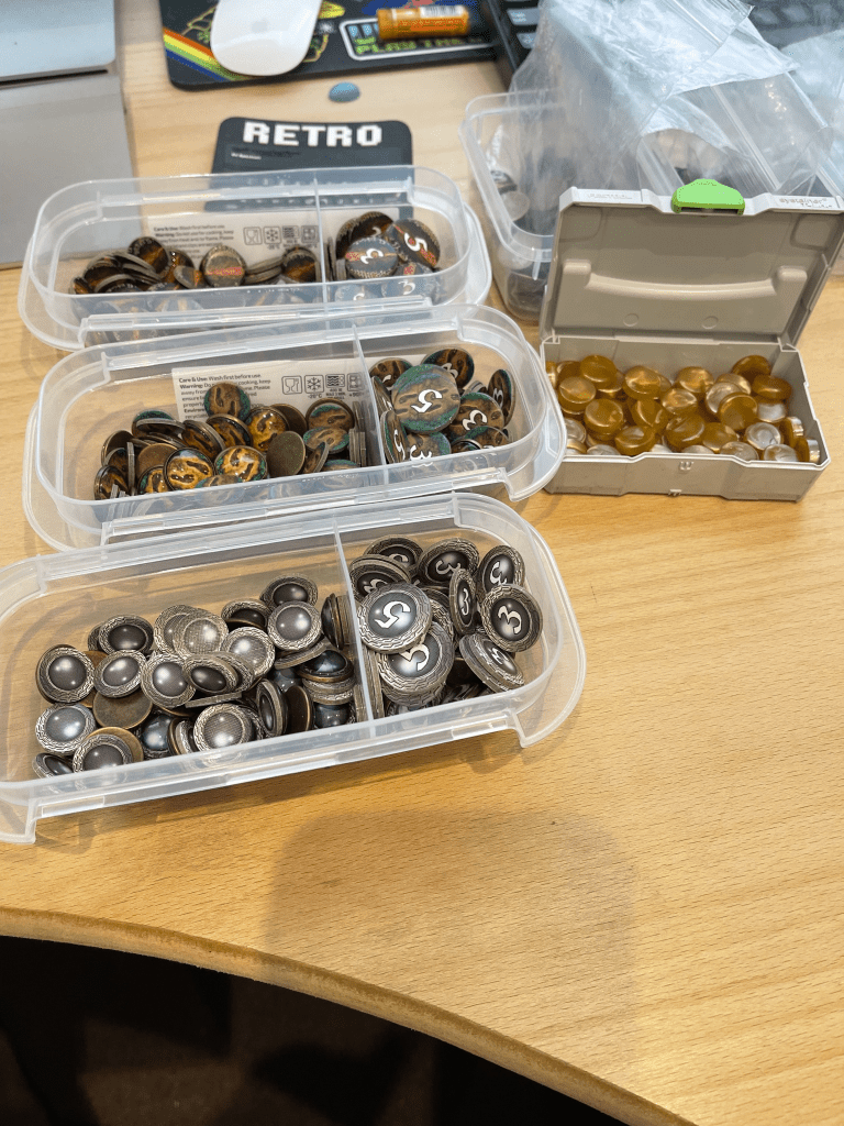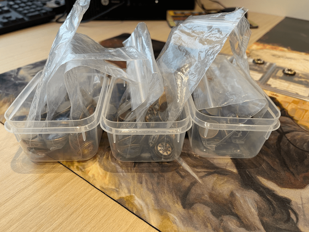 dishes, old jars, and the more usual token silos. Tokens seem to be a very personal thing, and with so many different ways of storing them, it’s pointless for me to try to show you them all. I will also say that I use a lot of my tokens for different games, the glass tokens I have from Drac’s Tokens, are used on my Heroes of Terrinoth playthroughs, as they are very alike, but I’ve now gone back to the card tokens that came in the updated base game, in denominations of 1,3 and 5.