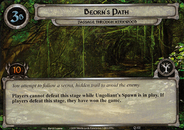 Remember Gimli’s willpower stat? This value is what heroes and allies can contribute to “questing,” which vaguely means the characters are working together to place “progress” on the main scheme. This is very similar to scheming by villains and minions in MC. You’ll need to exhaust characters (who will then be unavailable for combat), sum their willpower, and compare that to the value of enemy threat (which is different than the hero threat we mentioned above and is an actual stat on the enemy and location cards) on any enemies and locations in Staging. There is a little unknown in this math since after you decide which of your characters will quest, an encounter card is flipped for each player (very analogous to dealing out encounter cards in MC, except here, these cards go to the shared space called the Staging Area and are not engaged with any specific player). If the value of the combined willpower exceeds the value of the combined threat after all cards are revealed, progress has been made! The value of the difference is placed on the active location (which has a threshold allowing it to be “explored” and thereby discarded) and then on the current stage of the Quest card. Beorn’s Path (pictured above) needs 10 progress; once that is reached on this third card of the Passage through Mirkwood quest, you win (if Ungoliant’s Spawn is not in play, as specified at the bottom of that card).