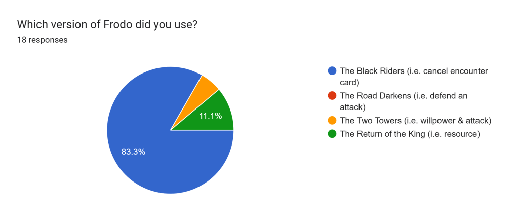 It looks like I was the only one to use The Two Towers version of Frodo! I thought his ability to get extra willpower or extra attack would be useful when one player is isolated from the group, all their allies are discarded, and they are left with just heroes. Most people went with Cancellation Frodo, which I can’t fault them for. There are some horrible treacheries in this quest.