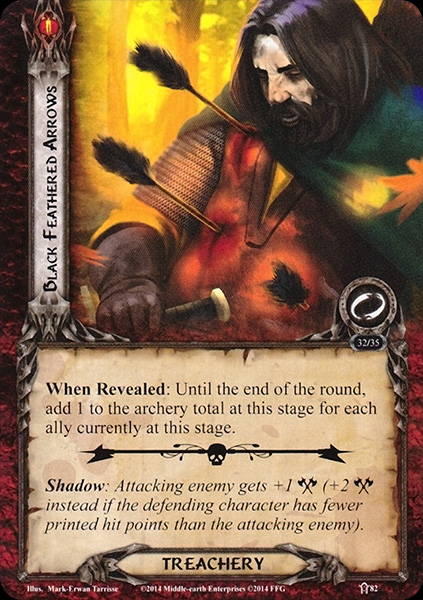 The card that got the most votes for least favorite encounter card was Black Feathered Arrows. Against decks that use ally swarms, this card will shred your boardstate to pieces. There is already a lot of archery and archery-adding cards in this quest, and this one can definitely take it over the top. Get those Tests of Will ready!
