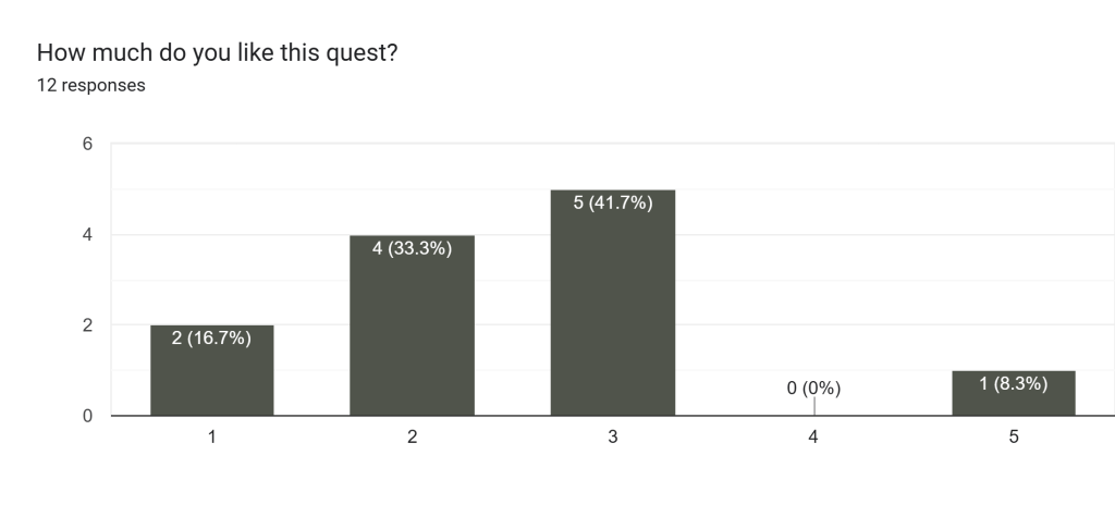 - Average opinion on the quest: 2.5 (This makes it the lowest rated quest so far in the saga, just barely lower than last week)