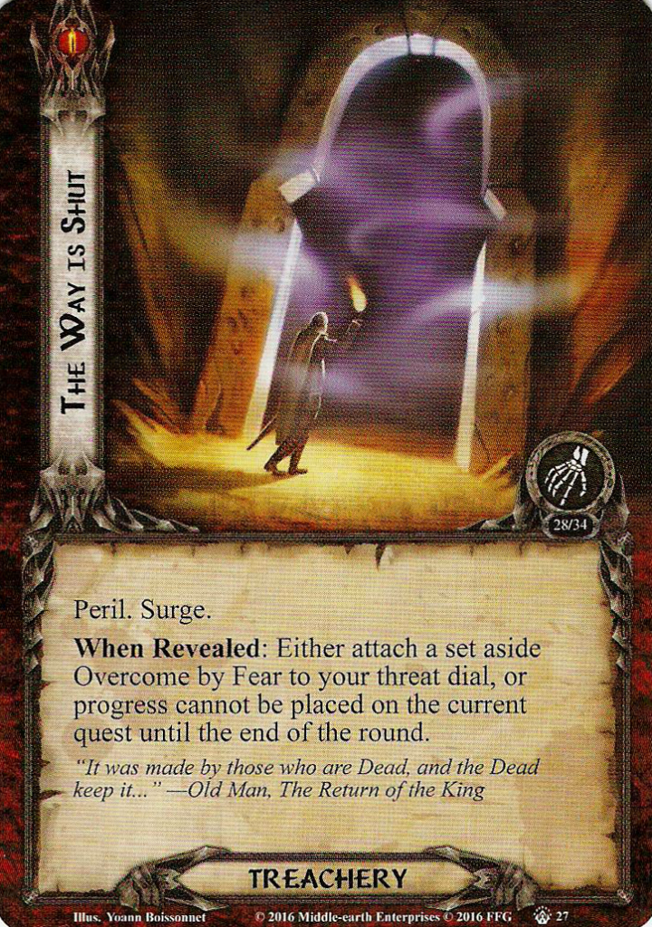 The winner of least favorite card, with five votes, was The Way is Shut. In a quest where you want to keep your threat dial clear of Overcome by Fear and go through the quest as quickly as possible, either choice here is bad. And it has surge! And peril!
