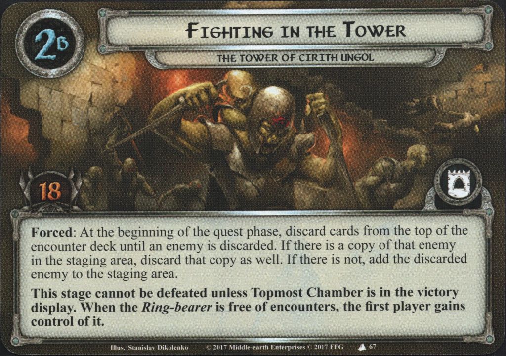 The orcs are fighting amongst themselves! This effect is a ton of fun and can cause some very swingy games. It incites keeping a number of enemies in the staging area, making secrecy and low-threat decks very attractive. This is why you don’t let the Watchers drive your threat into the higher end during stage 1B. It is hard to predict what this effect will do – technically, you can scry the encounter deck, but you will more or less have to do it every round, so try to enjoy the ride instead. As we can see, several of the encounter cards will have similar effects, sofortunes can change rapidly. Use the chaos to your advantage and keep a steady questing pace, placing the required progress. If you managed to clear the Watchers, someone at your table has the capability to fight – use it to your advantage. In Saga, you will also need it to clear the Wraiths. Use attackers to clear enemies that would start engaging due to threat, or to trim the staging area if it gets too clogged. But the main priority should be to quest, remove locations, and work your way up towards the Topmost tower. Once you travel to the Topmost tower, Shagrat is added to play.