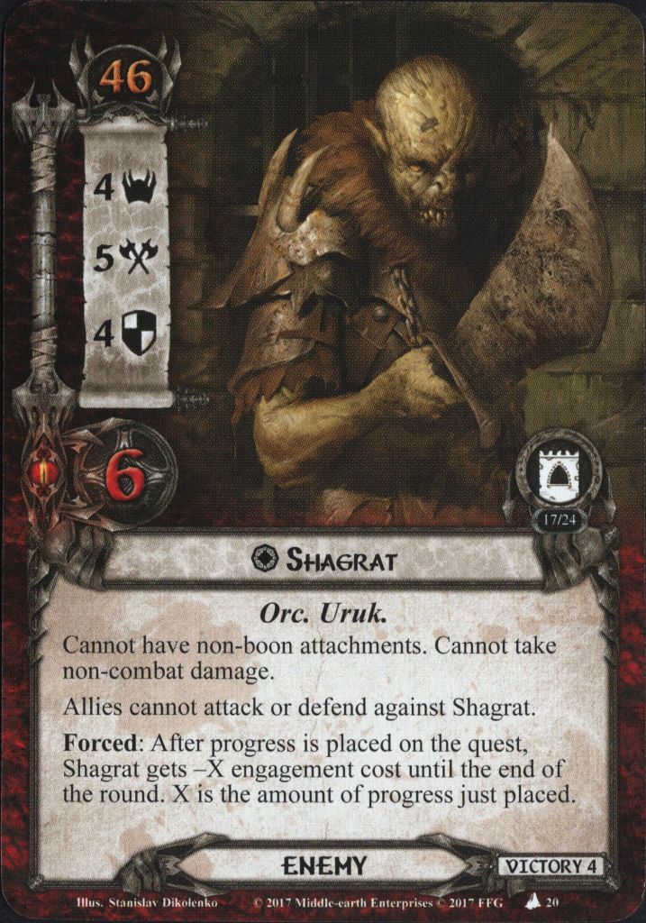- Remember that you don’t have to kill Shagrat if you don’t care about the boons he is taking. The next scenario requires your full focus, so you may not have time to play them anyway. It is worth considering, and besides the loss of cards, you aren’t really punished for letting him go.