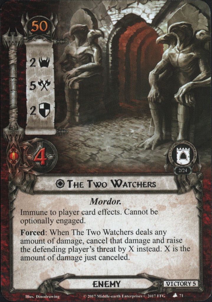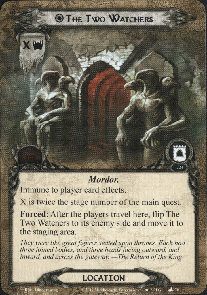 The first thing we see is that each non-unique location gets -1 threat and cannot leave the staging area (you cannot explore the tower before you get in!). This means that we can care slightly less about locations, but beware – while you may be capable of questing over a bunch of locations in stage 1, things will get much harder in stage 2. We also learn that this stage cannot be defeated while the Watchers are in play and that if the Watchers are enemy side up, then they are considered to be engaged with each player. The quest card has 0 quest points, meaning that it will advance as soon as the Watchers leave play. This also means that this is a good time to play side quests!