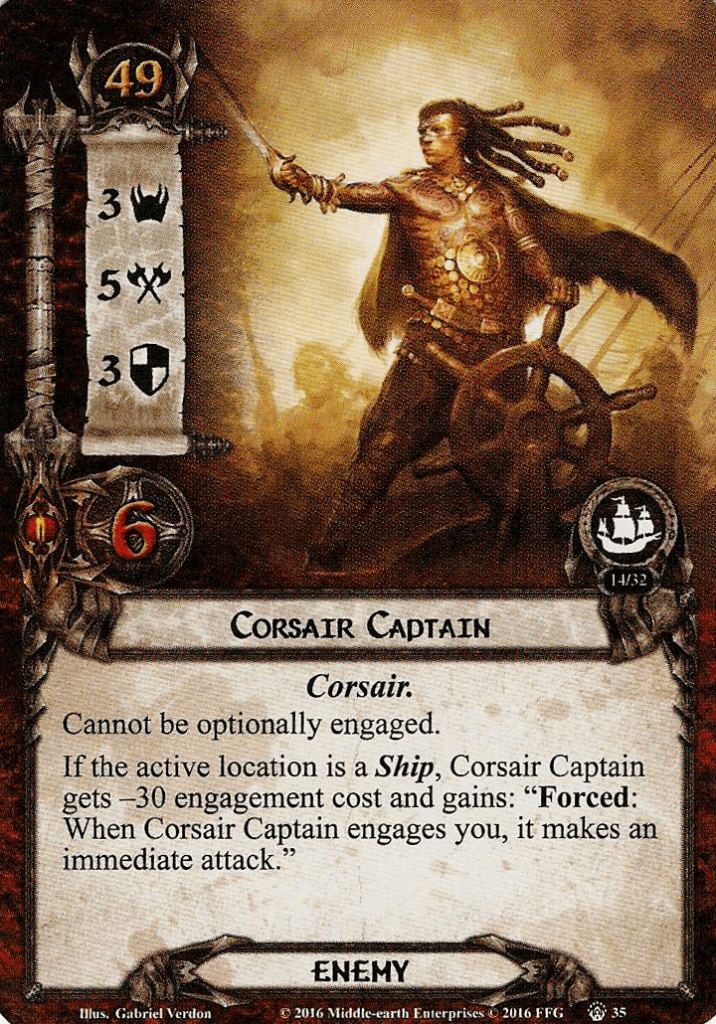 There were two controversial cards that appeared on both the favorite and least favorite lists: Corsair Captain, and Port of Pelargir. Corsair Captain is an interesting mini-boss enemy in this scenario that is not unique and not immune, meaning there are a lot of fun ways to deal with him. One of the achievements was even centered on that. However, he can be quite annoying if you see too many at once. The Port of Pelargir is not a big deal in the staging area if you’re not concerned with healing in large chunks. But if you are concerned with that, you’ll have to take a turn away from exploring ship locations to deal with it, or find some other creative solution.