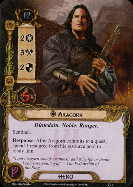 Given my requirements of Aragorn and Eowyn, I had to decide if I once again wanted to play a tri-sphere deck. Forest Snare is a lore card, so if I want any chance of playing it, I would need to choose another lore hero as my third (either Beravor or Glorfindel). However, I ultimately decided against this; while tri-sphere worked well for Passage Through Mirkwood, I wanted to be able to play cards faster to have a better chance at taking down the Hill Troll. Therefore, I focused on Hill Troll technique #1: delay. To have at least one turn of delay, I needed a starting threat below 30. Since Aragorn and Eowyn have a combined starting threat cost of 21, I needed my third hero to have a starting threat cost of 8 or lower. This reduced my options to Theodred, Dunhere, and Eleanor.