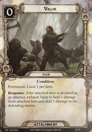 Mendor’s Support remains as a boon in my player deck, and Lingering Venom remains as a burden in the encounter deck. Valor is permanently attached to Aragorn after defeating the Hill Troll! Theodred has the most damage on him out of my three heroes, so he will be chosen as the prisoner in Escape from Dol Guldur.