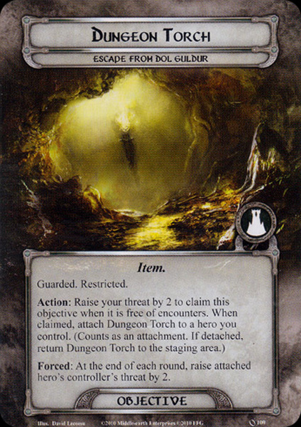 Finally, you can’t talk about this quest without talking about the objective cards: Gandalf’s Map, Dungeon Torch, and Shadow Key. While they seem nasty at first glance, experienced players know there’s a way to work around the collection of the objectives. This usually looks something like: grab Gandalf’s Map first and put it on your main quester — they don’t usually attack or defend anyways. Then, wait to grab the Shadow Key and Dungeon Torch until the very last questing phase of the game. You should have enough progress tokens on Stage 2 of the quest, and the Nazgul should be dead. Then, in the questing phase, you can grab the two objective cards, which instantly causes the quest to progress to Stage 3. While you still have to raise your threat by 4 to claim these two objectives, so long as you can quest for 7 progress (enough to clear Stage 3), you should never have to trigger the end-of-round abilities on these two objectives. In this way, the Shadow Key never damages your hero, and the Dungeon Torch never raises your threat by an additional 2 points.