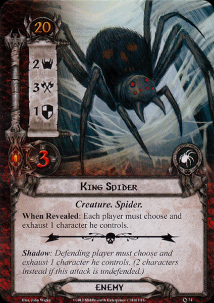 Well, there you have it: the first loss of my ultra-campaign. I knew it was only a matter of time and that Escape from Dol Guldur was the most likely place to have trouble. This playthrough perfectly exemplifies what makes this quest so hard for solo players: set-up. Regardless of the number of players in the game, there will be three encounter cards in the staging area to start the game. And as it turns out, most combinations of three cards are brutal for a solo player who only has access to two heroes at the start of the game. In this playthrough, I started with two enemies (King Spider and Dol Guldur Orcs) and quickly drew a third (Cavern Guardian) and a fourth (Hummerhorns), which was not compatible with me surviving very long.