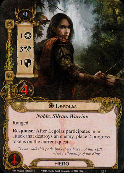 When deciding on a replacement hero, my first thought was that Escape from Dol Guldur is a combat-heavy quest. Not only do we have new big baddies like the Nazgul of Dol Guldur and the Dungeon Jailor, but we also have some bad enemies returning from previous quests, like Ungoliant’s Spawn and Chieftain Ufthak. Therefore, I decided to replace Eowyn with a tactics hero, the first of my ultra-campaign. The problem is that none of the three tactics heroes from the Core Set (Thalin, Legolas, and Gimli) come close to replacing Eowyn’s questing power. For this reason, I decided to choose Legolas as my third hero, in hopes that his ability to place progress tokens on the quest after killing enemies would help pick up on the questing slack. Welcome Legolas!