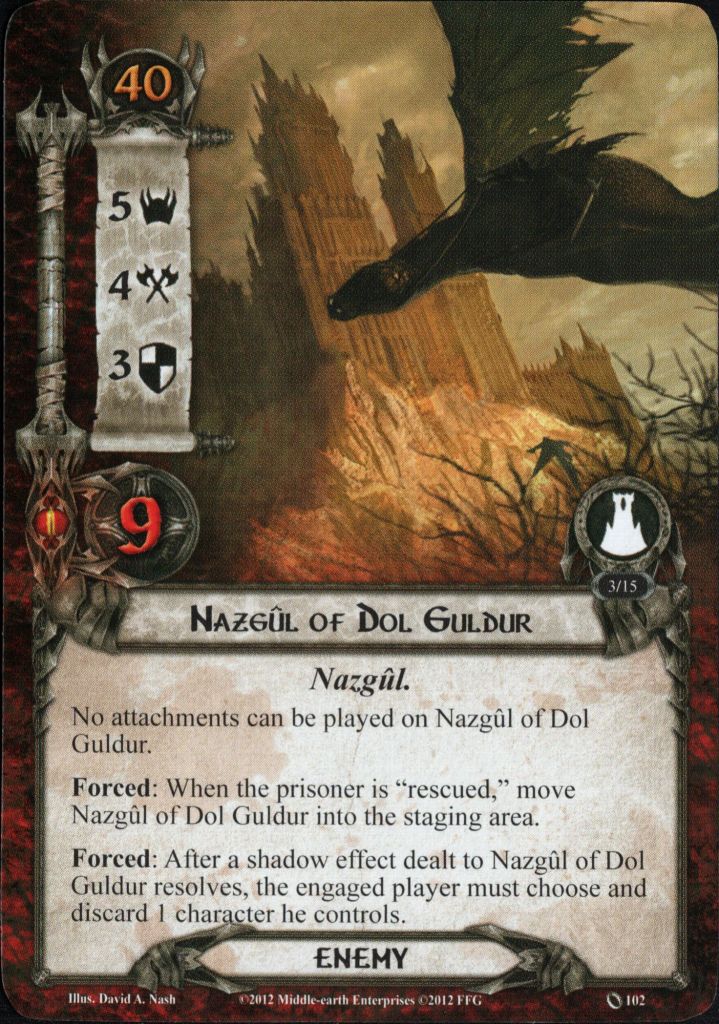 - The Nazgul’s second forced ability (if a shadow effect resolved, discard a character) is nasty. Hopefully, I can draw a Feint at some point to avoid a Nazgul attack and kill it quickly.