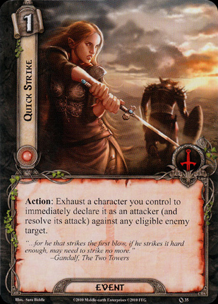 For the first time, I can use tactics cards to my advantage! However, I only have one tactics-resource generating hero, so I have to be careful about how costly my cards are. Some choices were obvious 3x includes. Quick Strike and Feint are two great events that allow you to flip the standard “defend an enemy and then attack it” on its head. Horn of Gondor and Blade of Gondolin are likewise two cheap attachments, the first of which provides some much-needed resource generation for tactics, and the second of which helps Legolas place even more progress on the quest after killing enemies. Finally, Gondorian Spearman and Veteran Axehand are the two go-to cheap tactics allies from the Core Set and provide some much-needed extra attack, so three copies of each of them went into my deck as well.