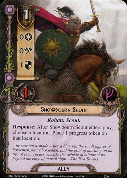 - Snowbourn Scout is best used when there is a location in play that only needs one more progress token to be fully explored. Luckily for me, this quest includes the Tower Gate location, which is a perfect target for my little scout to explore.