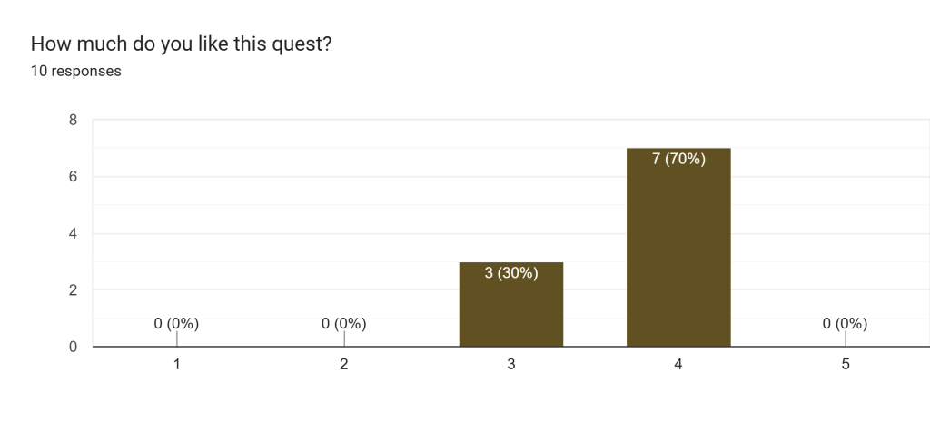 From the votes during each week’s survey, these are the order of the saga quests based on the average rating for the question “How much do you like this quest?”
