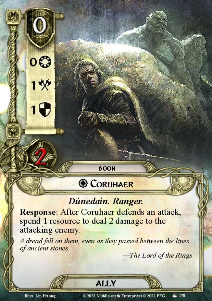 The winner for least-favorite encounter card was Feeble and Weary. This one is an interesting design–it’s essentially a redesign of the classic Necromancer’s Reach. However, you’re at least given a choice on this one: deal a bunch of damage out or fail the quest (more than likely). If you are using something like Strider early in the game to allow your only starting hero to quest without exhausting, this card can be a complete whiff early on when you’re still getting your footing. But later on in the quest this one hits hard. I think that is a hallmark of a well-designed encounter card.
