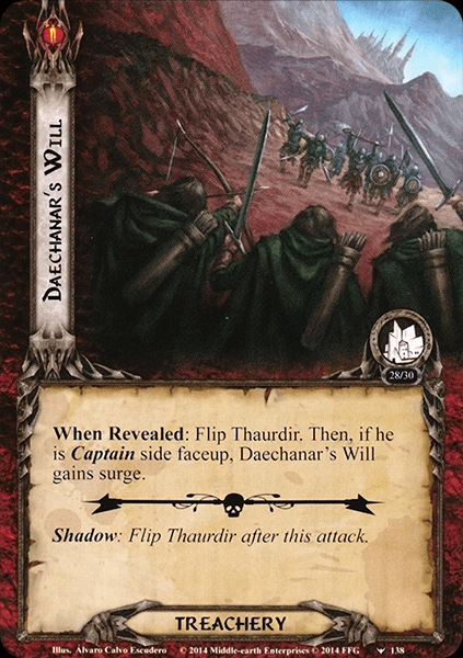 The winner of the least favorite card, again with only 3 votes, was Daechanar’s Will. Most of the time, this card will cause Thaurdir to flip to his Champion side and make an immediate attack against the first player. If you don’t have your defensive solution set up yet, that can be a big problem. In stage 2, or when Thaurdir was already on his Champion side, this card isn’t that bad, but then it also surges. The worst part about this card is probably the shadow effect. What’s worse than “This enemy makes an additional attack after this one”? Why, that would be something like “Thaurdir attacks after this.”