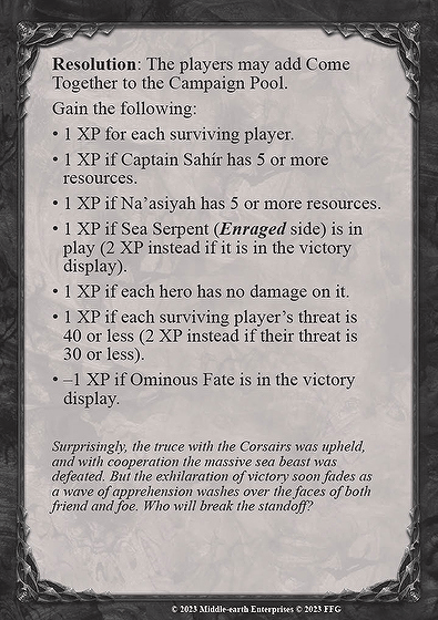 By keeping my threat very low (with Keen as Lances and Woodmen’s Clearing), I was able to avoid Na’asiyah’s attacks by cycling Gaffer Gamgee. No other corsair than Sahir and Na’asiyah was engaged in Stage 1. Unfortunately, regarding Stage 3, waiting too long for tentacles to defeat (17 rounds in my case) is something the Nightmare version didn’t fix.