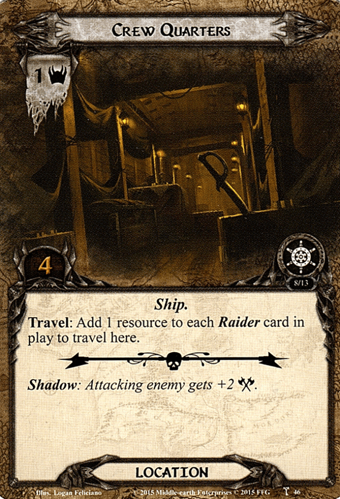 The overall favorite encounter card for this quest was Crew Quarters. I heartily agree with this one. This is one of the coolest designs for a location in the game. In the beginning part of the quest the travel cost makes things more difficult, but after you make your truce with the Corsairs, adding a resource to each Raider becomes a good thing! This is such a masterful way to use the mechanics to tell the story of joining forces with the Corsairs.